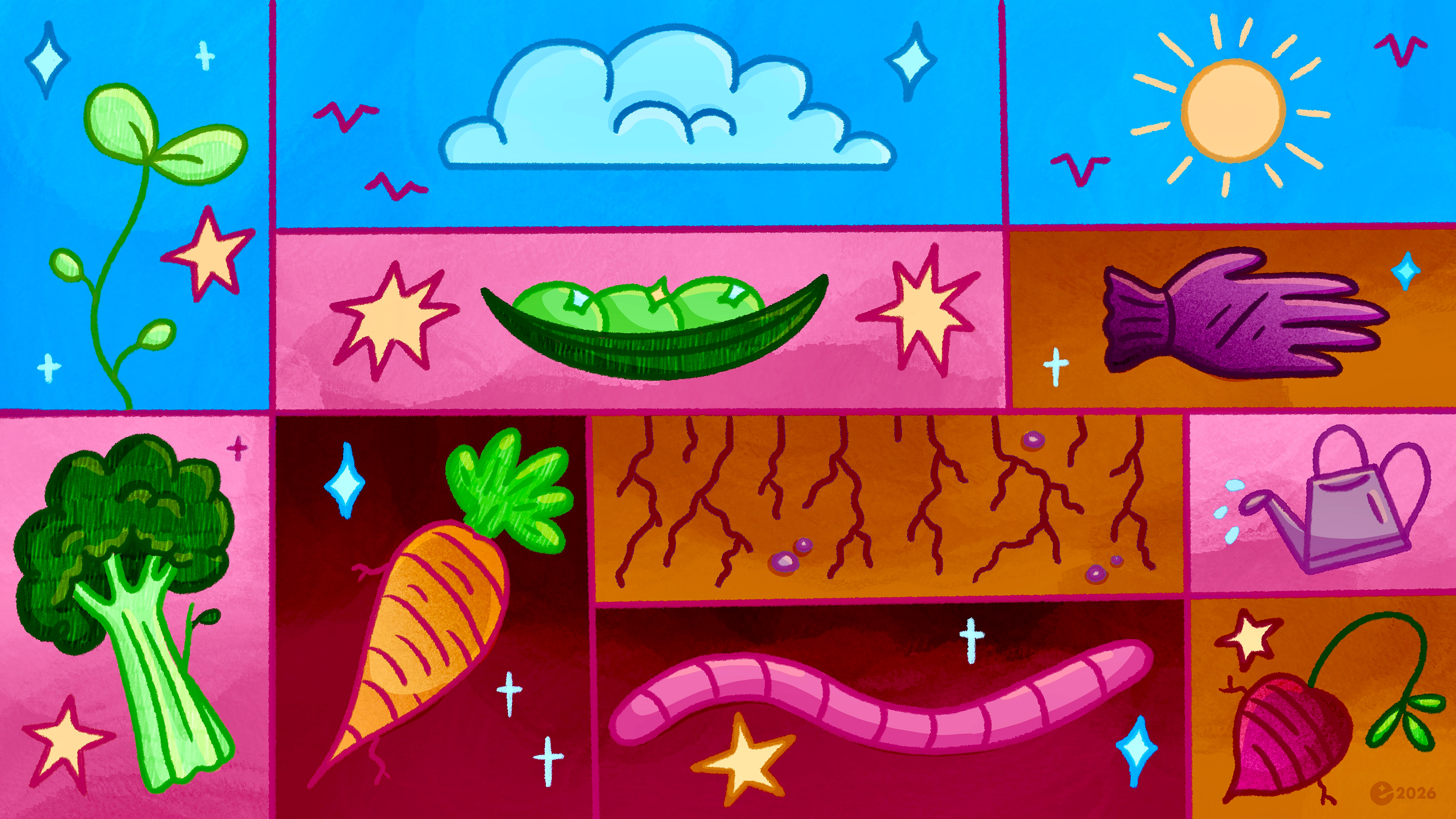 This illustration incorporates a grid-based composition inspired by recent trends in editorial design, using segmented “boxes” to visualize the relationship between what grows above and below ground.
